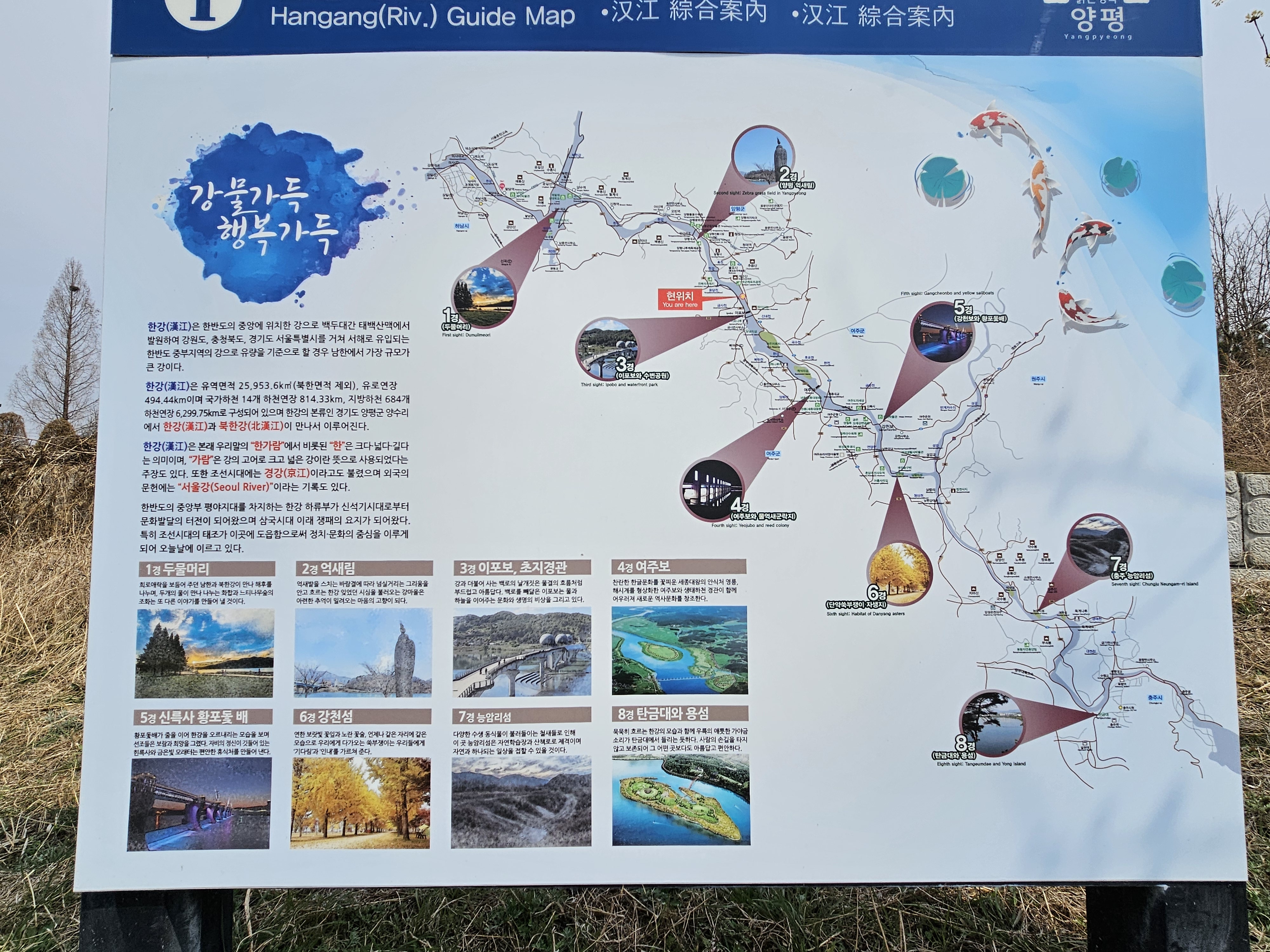 `1경 두물머리 2경 :양평 억새길 3경:이포보와 수변공원 4경: 여주보와 억새군락지. 5경:강천보와 황포돛대